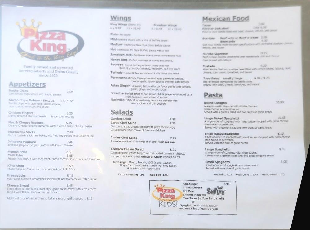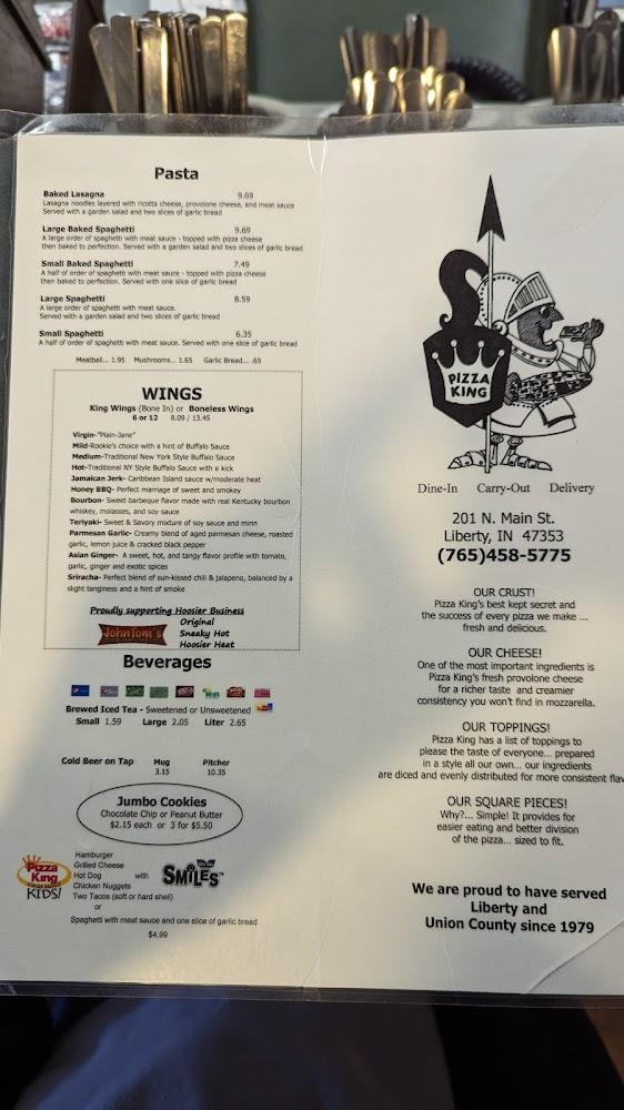Welcome to Pizza King of Liberty, your go-to family-friendly pizzeria located at 201 N Main St, Liberty, IN. Enjoy a relaxed dining experience with a diverse menu featuring delicious pizzas, pasta, sandwiches, salads, and tempting desserts. Our establishment, proudly managed by a veteran, offers quick service, ensuring you won't wait long for your favorites. We provide various amenities, including dine-in, carryout, and contactless delivery options. With accessible seating and restrooms, we welcome everyone. Whether you're in for lunch, dinner, or a late-night bite, Pizza King is the perfect spot to satisfy your cravings in a comfortable atmosphere.